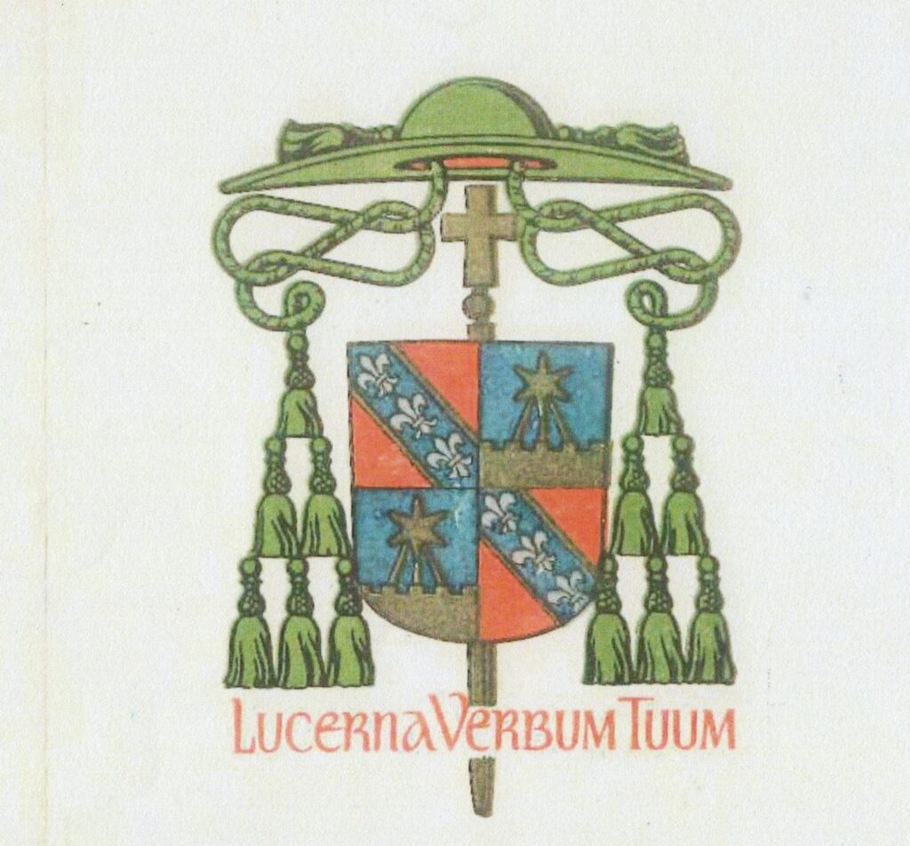 Insígnias: Episcopais (Chapéu prelatício com três fileiras de borlas, de verde e cruz processional.)